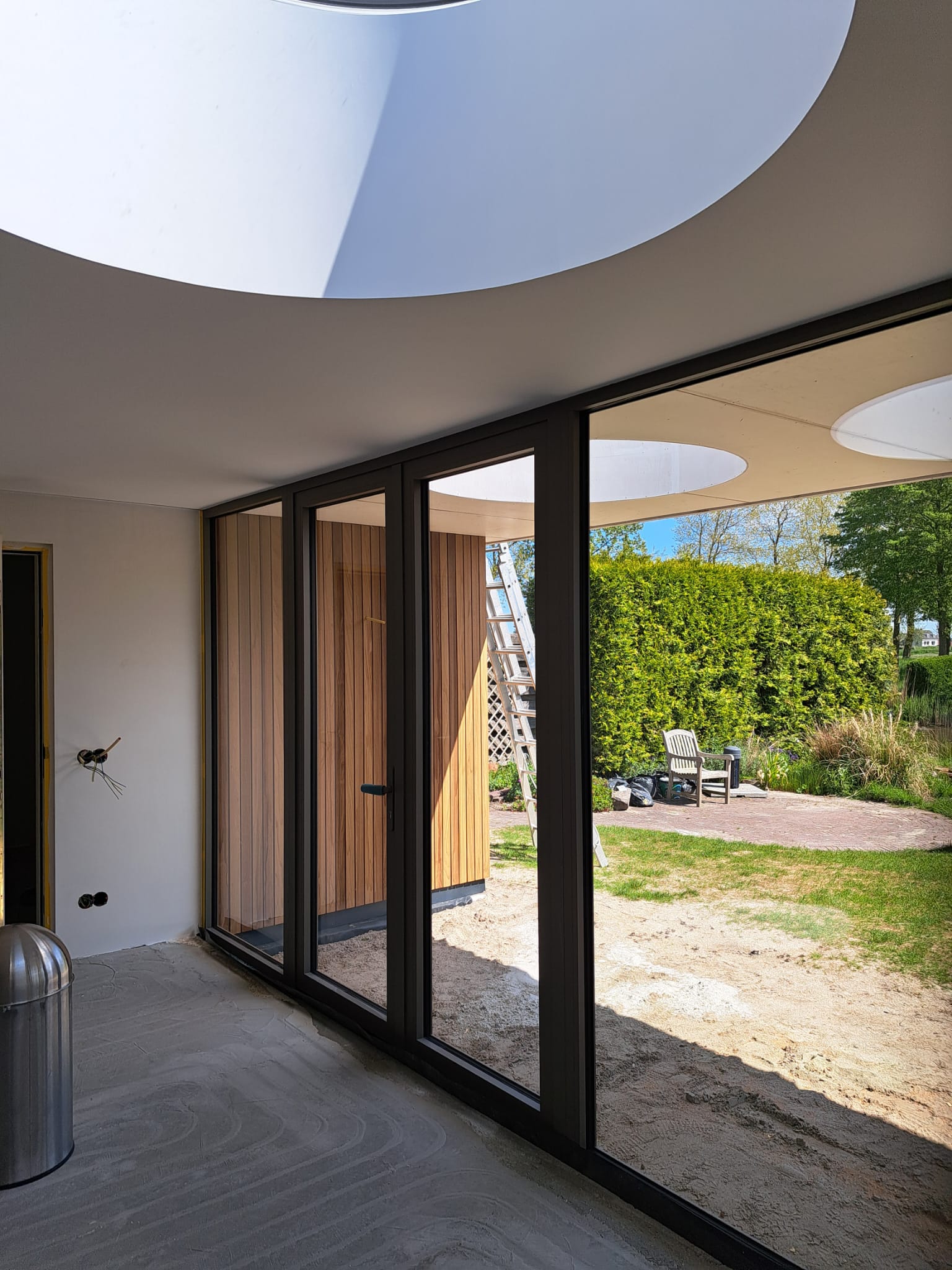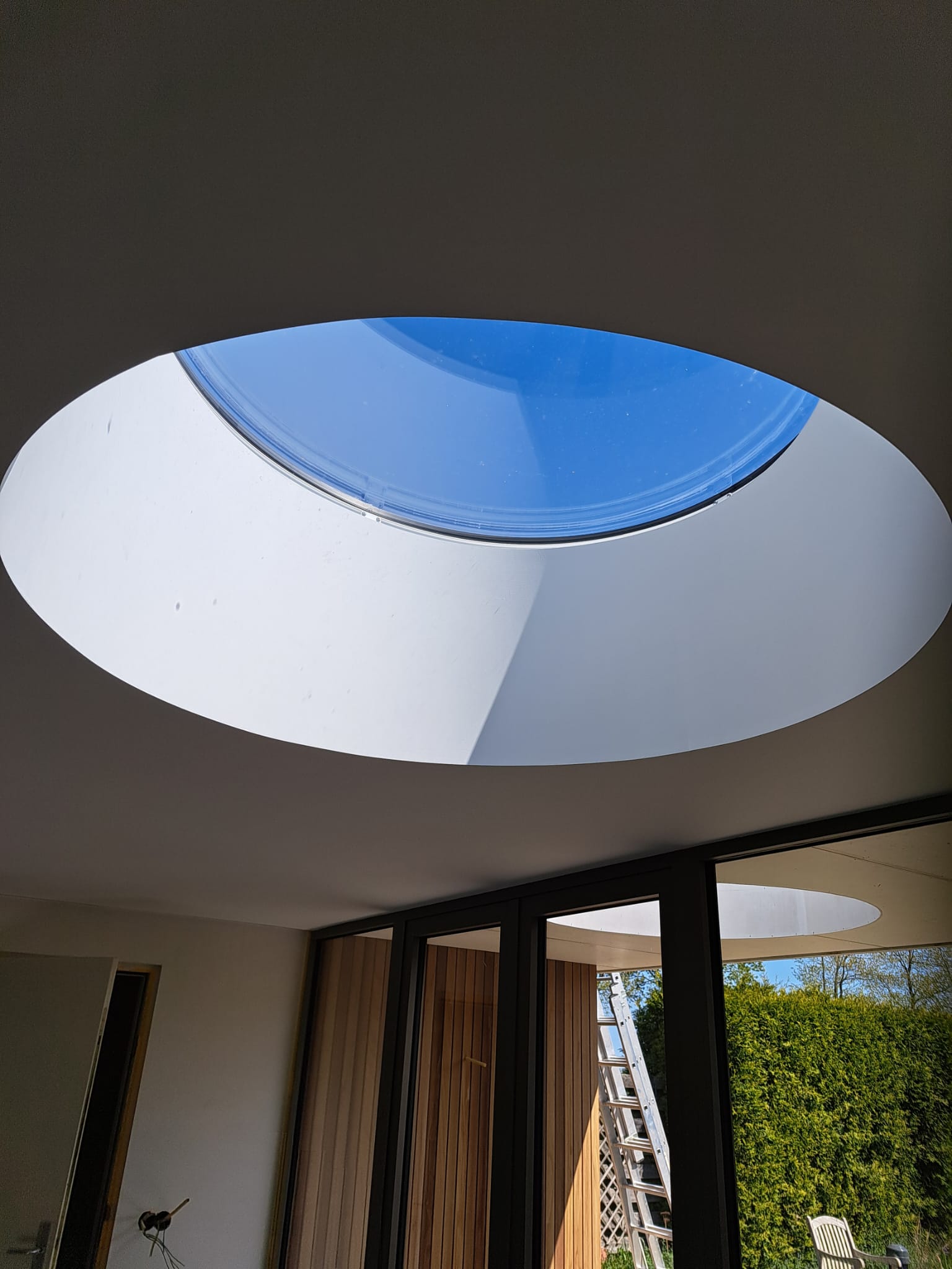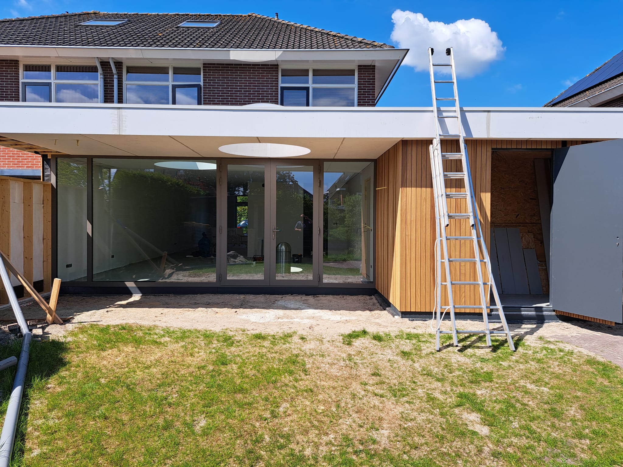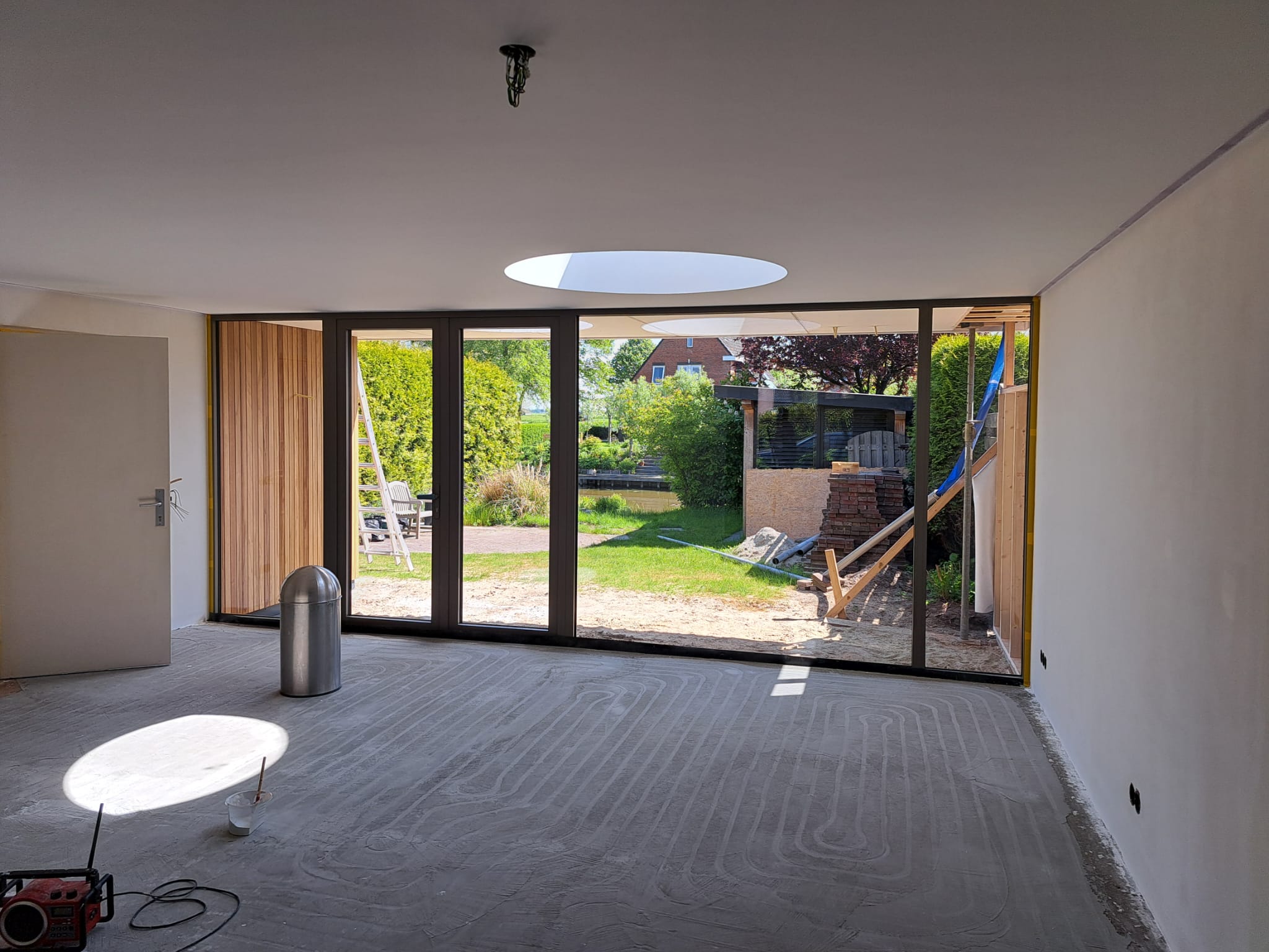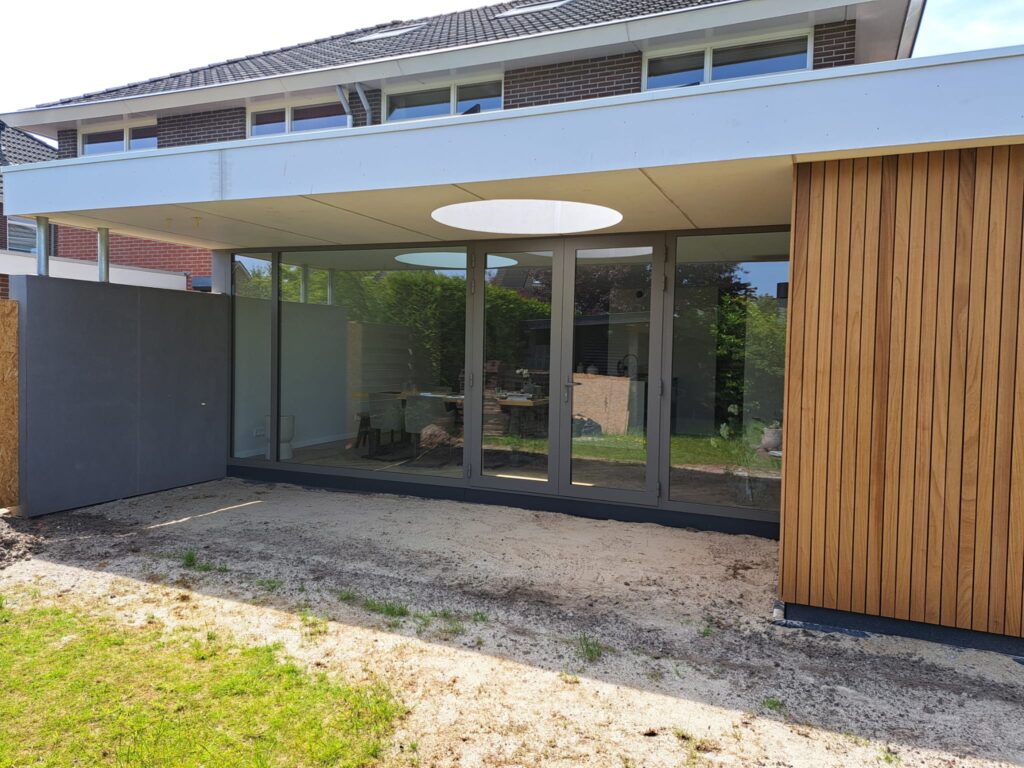 Voor deze twee-onder-een-kapwoning realiseerden we een ruime uitbouw, waarbij we twee ronde lichtkoepels plaatsten. Deze zorgen voor extra veel natuurlijk licht en maken de leefruimte licht en luchtig. Een mooie combinatie van functionaliteit en sfeer.
